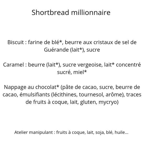 Biscuit à trois textures : un sablé croustillant, une couche onctueuse de caramel et un nappage de chocolat fondant, le tout relevé par une pointe de sel.